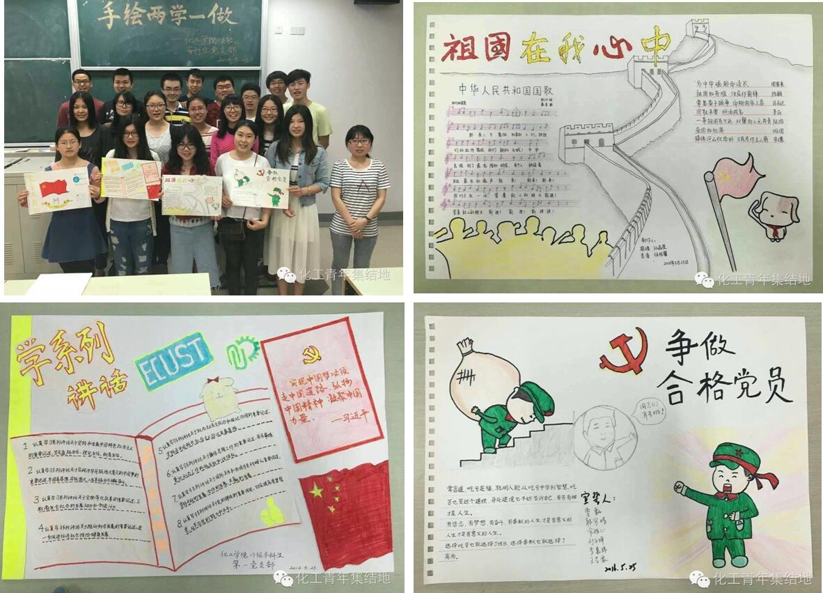5月25日晚,学院2013级本科生第一党支部在奉贤校区D教408开展了“‘两学一做’之我手绘我心”的主题组织生活。党员们以4-6人为一组,分成四组,分别完成了“学党章党规、学系列讲话,做合格党员”“弘扬爱国主义”等主题的手绘党报。两个小时的“学”与“画”,四个小组都顺利完成了自己手绘报,并在支部内进行了展示与讲解。韩宇晴和孙晶莹等同学完成的作品得到了大家的一致肯定。