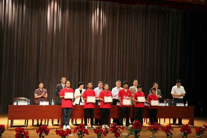 党委书记李涛教授宣读了《关于学院颁发“共育化工菁英助学金”的决定》,并颁发了证书。身着“爱校服“的14名化工新生从各位教授手中接过证书。