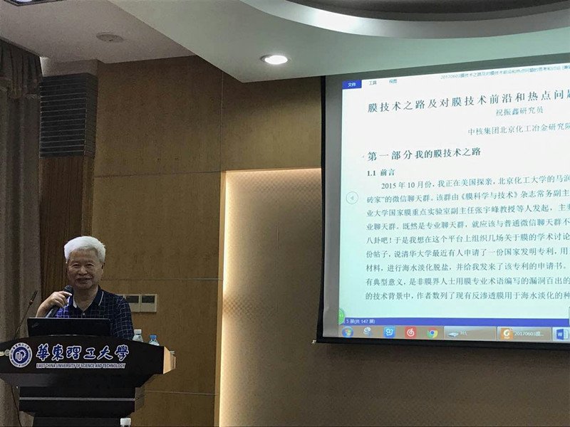 6月9日上午,中核集团北京化工冶金研究所祝振鑫研究员应邀来校访问,并在实验十六楼110室作了题为:“膜技术之路及对膜技术前沿和热点问题的思考和讨论”的学术报告。报告会由化学工程研究所所长许振良教授主持,浙江大学宁波理工学院雷引林教授、天津工业大学皇甫风云教授等教师与研究生70余人参加了报告会。祝振鑫研究员从他的出身、求学之路、工作之路和膜技术之路说起,分享了他的童年、中学和大学时代的轶事,以及工作后的心得体会,并重点讲解了他如何走上了膜技术的研发工作。同时,针对膜技术前沿和热点问题,祝振鑫研究员讲了自己的看法和观点。祝振鑫研究员风趣的讲话风格,热情洋溢的演讲感染了在场的研究生,并进行了热烈讨论与交流。此外,祝振鑫研究员与国产无码