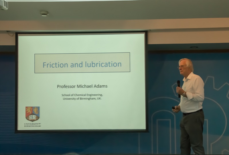 报告会上,Adams院士首先以摩擦利用的一个成功和一个失败案例的对比向大家展示了合理利用摩擦现象对人们生产和生活的重要意义。由此引出了科学家对于描述摩擦现象所做工作的历史进程,以各种实例向大家生动地介绍了摩擦现象的基础理论,极大地开拓了与会师生的学术视野。随后,他以皮肤与玻璃界面之间的摩擦和润滑研究为契机,着重介绍了摩擦与润滑技术在触控屏领域的技术进展,深入地讨论了震动、流体转换等因素对于润滑技术的影响规律,为广大从事摩擦学研究的师生提供了指导和帮助。