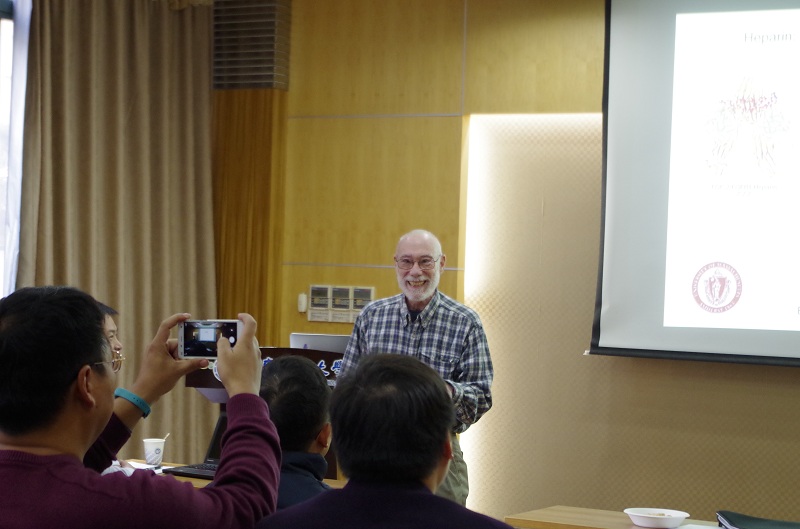 师生作了题为“Non-chromatographic purification of a monoclonal antibody: complex coacervation with hyaluronic acid”的学术报告。在报告中,Dubin教授系统的介绍了聚电解质与蛋白质的作用机理以及聚电解质材料在生物质提取、分离、纯化等方面的应用,并就其课题组在上述的研究成果进行了分享。与会师生反响热烈,踊跃提问,Paul Dubin教授进行了详细解答。