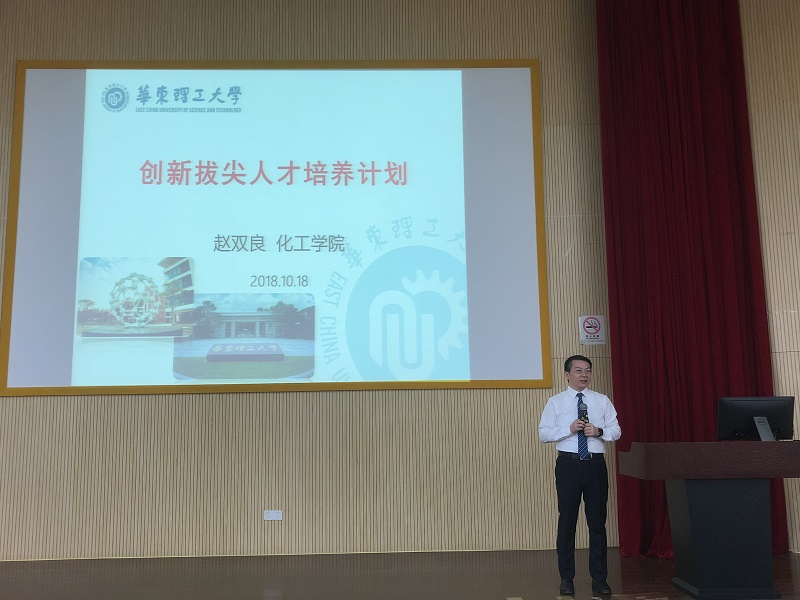 接着赵双良为同学们详细介绍了“创新拔尖人才培养计划”的培养模式、培养过程、导师名录、选拔流程以及淘汰机制等方面的内容,并鼓励同学们积极报名,投身科研,为华理的“双一流”建设增添光彩。最后,赵双良对同学们提出的问题进行了细致解答,宣讲会在热烈的掌声中结束。
