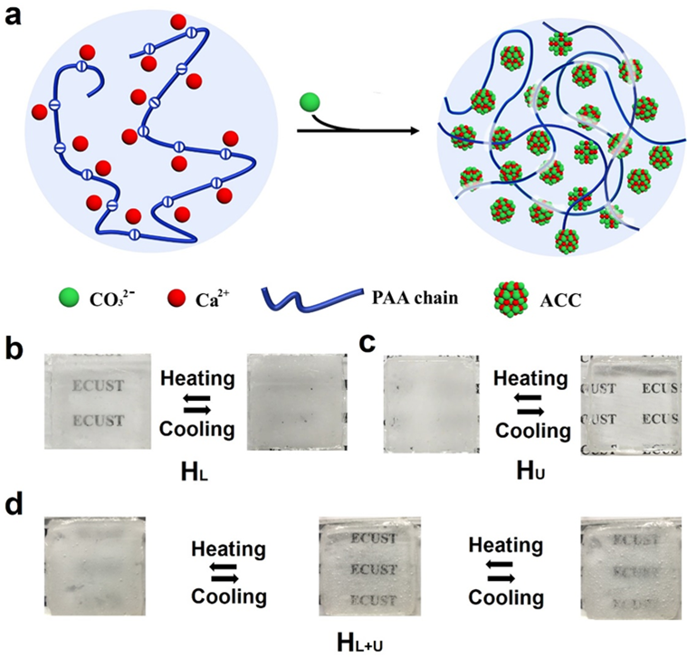 利用有机无机杂化组装的手段,一系列仿生杂化超分子材料应运而出,并表现出了广阔的应用前景。然而,目前所合成的大部分有机无机杂化组装材料缺乏对外界环境的响应性,其应用范围也因此受到了限制。王义明研究员与郭旭虹教授团队利用无定型碳酸钙纳米粒子与聚丙烯酸分子进行原位组装制备出了一系列具有温度响应性的超分子水凝胶材料,并且可以通过调节无定型碳酸钙纳米粒子的含量,对所制备水凝胶材料的温度响应类型进行灵活的调控,使其分别表现出最高临界溶解温度(UCST)、最低临界溶解温度(LCST)以及兼具UCST和LCST的特性。此外,该团队还进一步设计了一种基于LCST和UCST水凝胶的二进制紫外信号切换控制系统,通过控制外界温度,对紫外光在两种水凝胶中的透过率进行控制,从而实现对目标荧光信号的切换。该项研究工作不仅创新性地发展了一种简单的、利用超分子杂化组装的方式制备具有多重温敏性的超分子水凝胶材料,还通过温度控制型荧光信号切换模型系统的建立展示了具有刺激响应性超分子杂化组装材料的应用潜质。