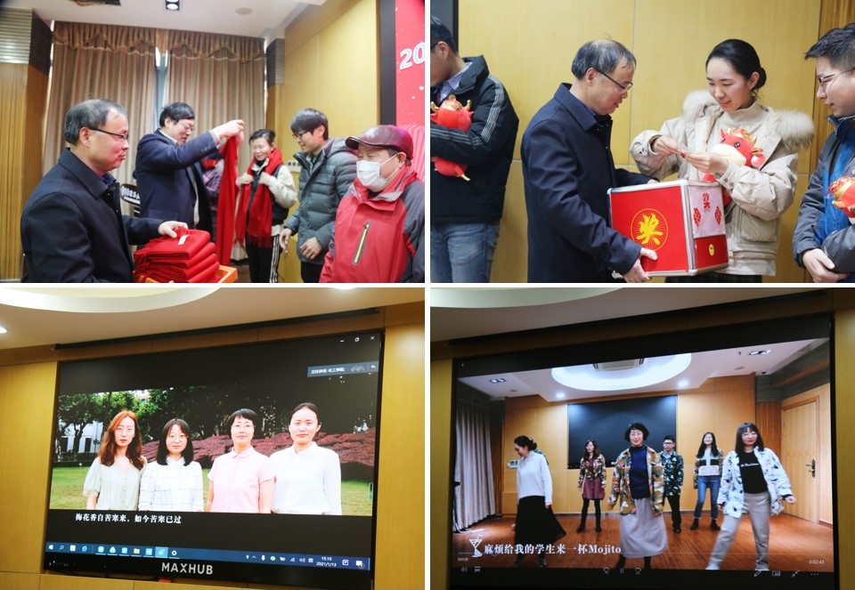 活动现场首先出场的是学院2020年加入大家庭的新会员们,新会员逐个进行了自我介绍,学院党委书记朱学栋、副院长郭旭虹、工会主席朱志华为新人们送上了新春祝福及牛年吉祥物。学院思政党支部为活动精心准备了讲述动人抗疫故事的诗朗诵《梅花化春梨》以及歌舞《来一杯春风化雨的mojito》,清新欢快的舞蹈表演展现了思政老师们活泼亮丽的风采。活动现场还请来了2021年本命年的老师们,学院领导一一为他们带上红围巾,相信学院的这些“牛人”一定会给学院带来新气象。