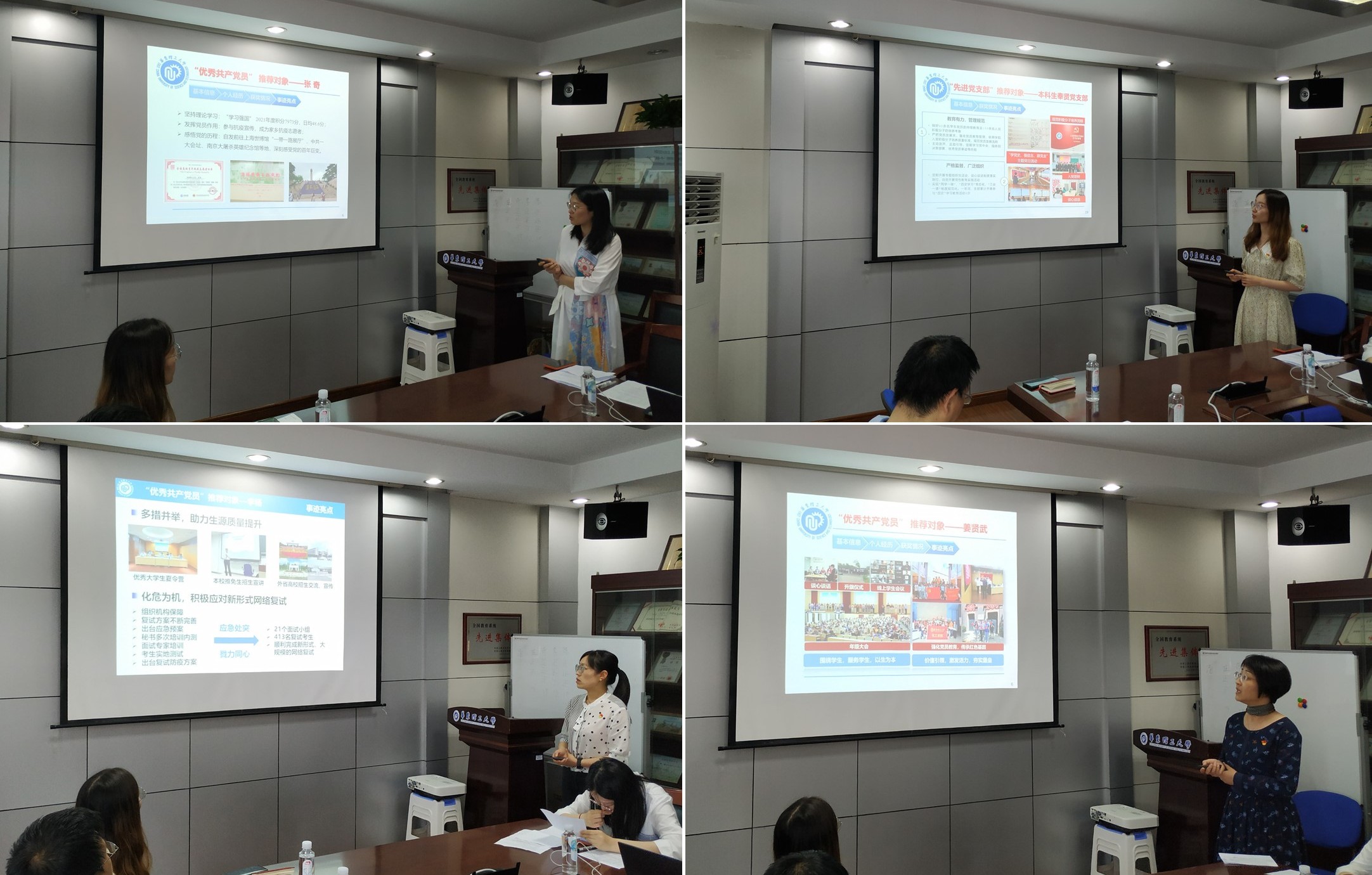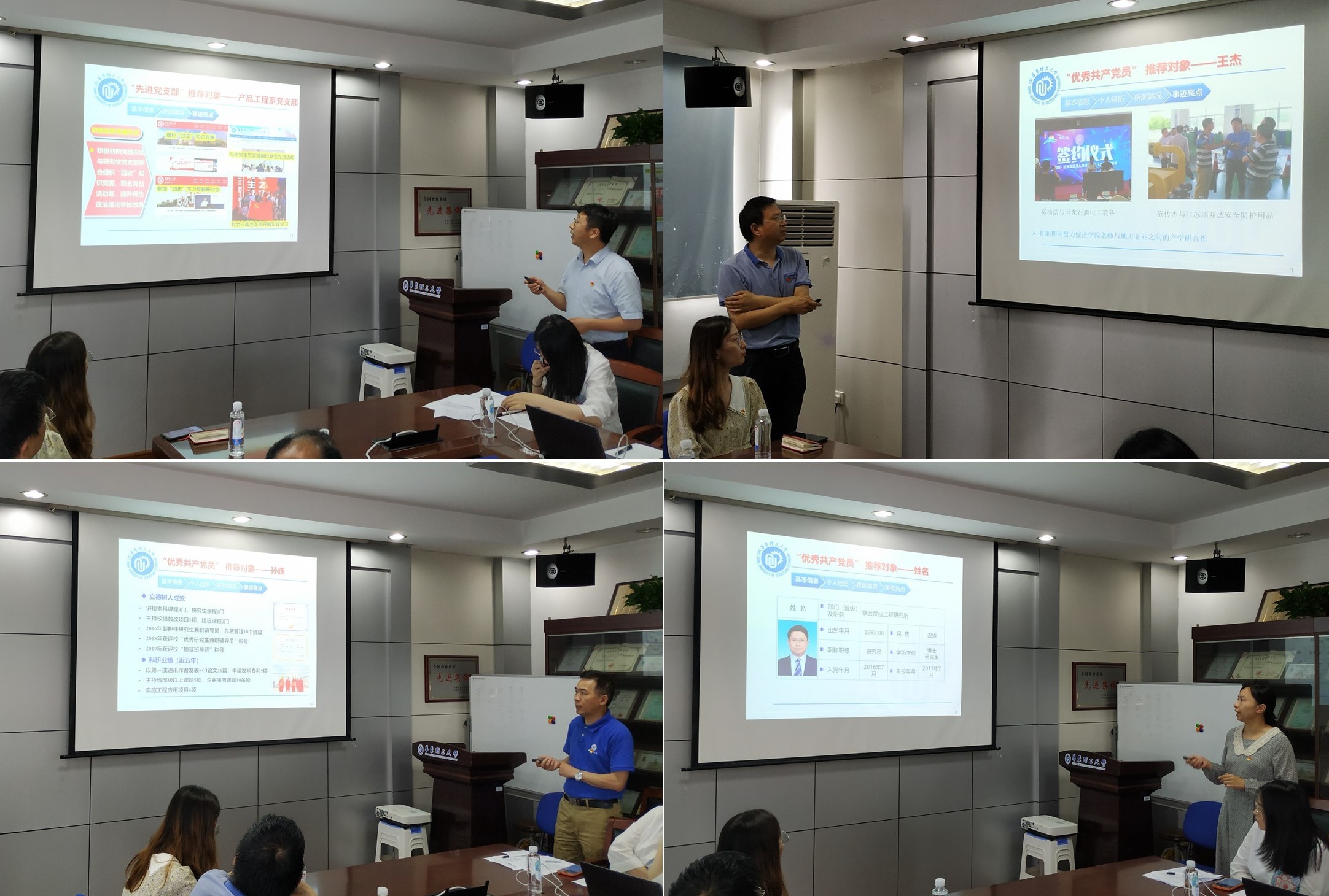 评审会上,党支部书记从基本信息、个人经历、获奖情况、事迹亮点等方面对本支部推荐对象进行了详细介绍。参评对象中既有在教学科研、管理服务等方面表现突出的优秀教工,也有在学术竞赛、社会工作、志愿服务等方面表现突出的优秀学生,他们在日常学习、工作、生活中均发挥了党员的先锋模范作用。