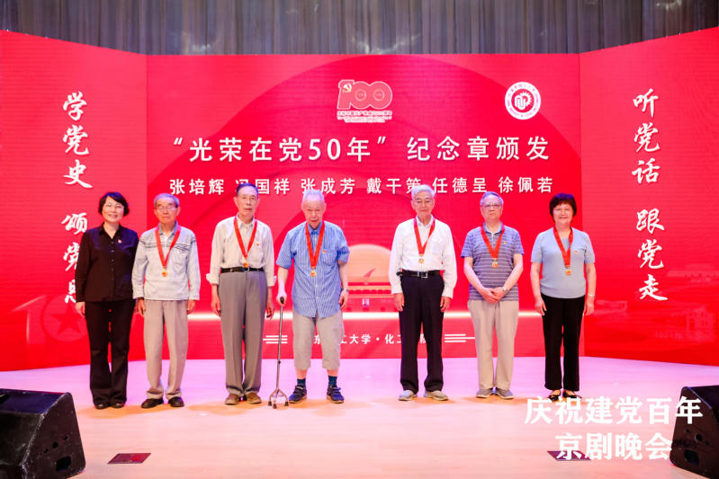 晚会现场,杜慧芳为到场的6位党龄50年以上的老党员代表颁发“光荣在党50年”纪念章,感谢他们半世纪以来兢兢业业,为学校的发展和建设所付出的辛勤努力和贡献。任德呈老先生作为老党员代表上台发言。他讲到:“忆昔抚今, 鞭策励志。行而不辍,未来可期。要对照新时期对共产党员的要求,不断坚定理想信念,强化自我教育,筑牢思想防线,不忘初心、牢记使命,为实现中华民族伟大复兴的中国梦贡献自己的光和热!”他以自己的亲身经历,激励年轻党员要感党恩、听党话、跟党走,为党和国家多做贡献。其崇高信念感染了现场所有的人。