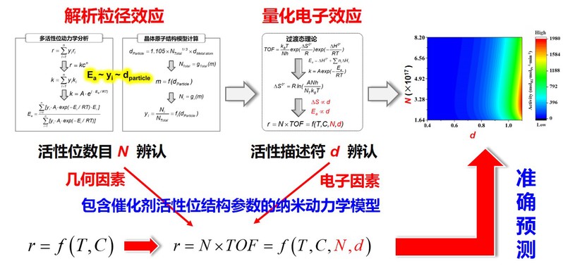 本系列研究工作基于前期建立的通过排除金属电子效应、解析粒径效应,实现催化剂活性位点的动力学辨认方法(J. Am. Chem. Soc. 2014, 136, 16736-16739);发展的通过排除粒径效应、量化电子效应,实现易实验测量的活化熵、金属电子结合能/电荷可作为催化活性描述符方法(J. Catal. 2017, 356, 186-196; 《化工学报》中华人民共和国成立70周年专刊:2019, 70, 3645-3650);进一步结合过渡态理论与Temkin方程,量化了催化剂Pt电子结合能对动力学参数(ΔS和Ea)的影响,建立了包含催化剂活性位数目(N)和电子性质(d)的纳米动力学模型,实现对宏观催化性能的准确预测与优化调控,将动力学分析从传统的反应器设计拓展到催化剂设计。此外,创新提出了催化剂组成/结构影响与粒径效应解耦的新策略,发展了机理驱动的催化反应动力学解耦方法,研制成系列多活性位、动力学互促的碳载Pt基催化剂,并在化学制氢与生物质氧化等反应体系中使其比质量活性呈数量级提升(iScience 2020, 23, 100922; ACS Catal. 2020, 10, 11417-11429; J. Catal. 2020, 389, 492-501; J. Catal. 2020, 385, 289-299; AIChE J. 2021, e17339)。