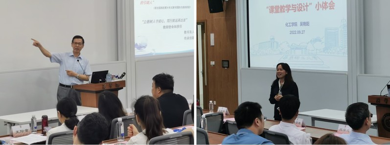 许志美教授以《一点感悟——由我的教师生涯谈起》为题,将他在华理38年的执教历程娓娓道来,并讲述了他与教研组的教师共同努力将《化学反应工程》建设成为国家一流课程的经验,他强调在教育中要秉承以人为本的教育理念,通过以学生为中心来提升其在学习中的获得感,培养学生的综合能力,同时,要充分利用现代教学技术方法,调动学生学习的积极性、主动性和创造性。吴艳阳副教授与大家分享了《“课堂教学与设计”小体会》,与青年教师一起探讨如何上好一门课,她强调每位教师要带着敬畏之心对待每一堂课,认真做足准备之后才能走上讲台,她从课前准备、课堂授课、案例设计、信息技术融合等方面,介绍了教学设计的要点。