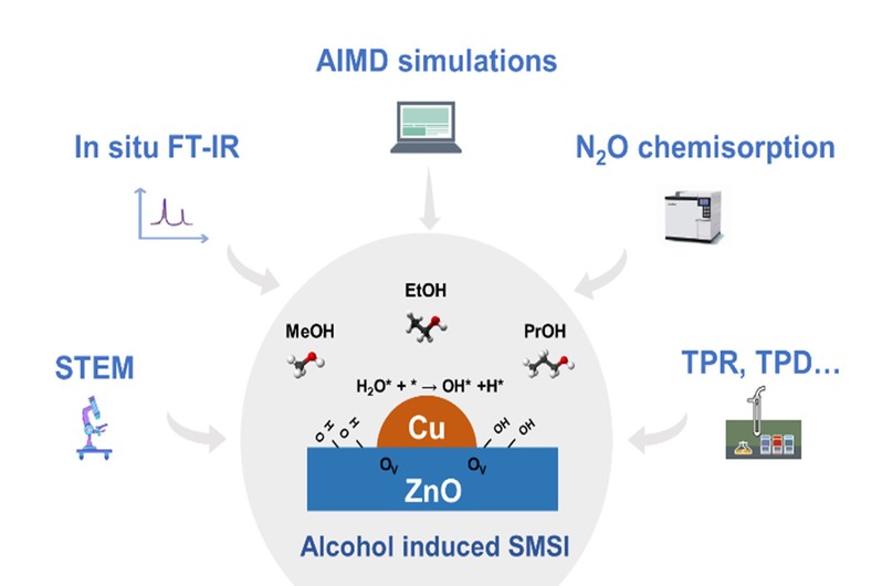 针对上述问题,我院朱明辉特聘教授课题组对负载型Cu/ZnO催化剂金属-载体界面结构受不同种类醇/水混合气体影响进行了系统性研究。结合原位表征技术与理论模拟方法,研究团队揭示了醇/水/氢气混合气体的还原性、催化剂表面羟基化程度以及醇分子在催化剂表面结合力之间的协同作用机制,这一机制对于醇诱导SMSI现象的发生具有关键作用。
