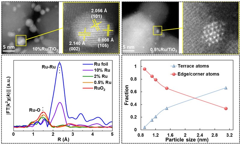 研究团队以TiO2为载体,通过改变活性金属钌的负载量制备了具有不同钌配位环境的Ru/TiO2催化剂。球差电镜和X射线吸收精细结构谱分析结果表明,制得的系列钌基催化剂中10%Ru/TiO2以高配位钌位点为主,而0.5%Ru/TiO2以低配位位点为主,前者平台位点居多,后者台阶位点和角位点居多。催化性能测试结果表明,钌配位环境显著影响了PET氢解制三苯的收率,平均配位数为~5.0的0.5%Ru/TiO2上能够获得较高的BTX收率(77%),而高配位数的Ru/TiO2上氢解过程会形成更多的气体和加氢饱和产物。
