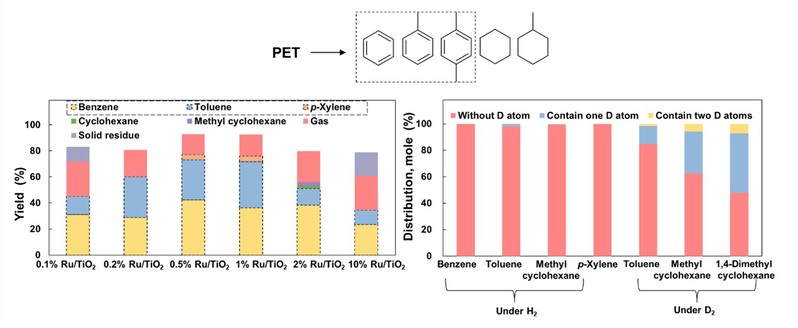 同位素示踪实验和密度泛函理论计算结果表明,PET氢解中间物种在低配位位点钌上更倾向于“直立”吸附,而在高配位位点钌上更倾向于“平躺”吸附。其中,“直立”吸附构型能够抑制苯环加氢及开环副反应,进而促进三苯生成。