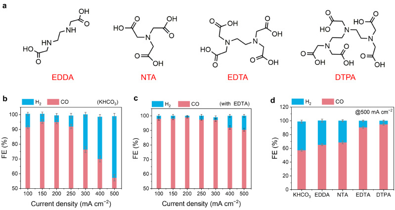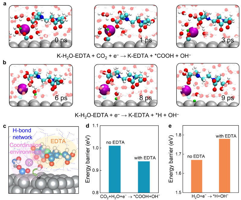 研究团队提出了路易斯碱配体分子调控电极-电解液界面双电层的策略,将微量乙二胺四乙酸分子及其类似配体作为电解液添加剂,并利用原位红外及从头算分子动力学计算揭示了乙二胺四乙酸配体在电化学界面处的动态变化及其在CO2还原中的作用机制。路易斯碱配体通过路易斯酸碱相互作用,重构了阳离子溶剂化壳层,并通过形成氢键破坏层重塑了界面氢键网络。该策略可进一步拓展至一系列商用催化剂中。该研究不仅提出了路易斯碱配体调控催化界面的策略,还揭示了路易斯碱配体对CO2电解的促进机制,提供了双电层中电解液组分相互作用的全新见解,为理解复杂的电化学界面组织提供了新视角。