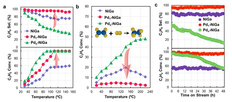 催化反应工程团队段学志教授、曹约强特聘研究员等在机理驱动的低碳炔烃选择性加氢催化剂设计与创制方面取得新进展,将单原子Pd嵌入NiGa金属间化合物表面,替换部分客体金属Ga位点以匹配关键物种的吸附构型,实现了低碳炔烃的高效选择性加氢。相关研究成果以“Embedding Single Pd Atoms on NiGa Intermetallic Surfaces for Efficient and Selective Alkyne Hydrogenation”为题在线发表在《德国应用化学》上,并入选Very Important Paper。