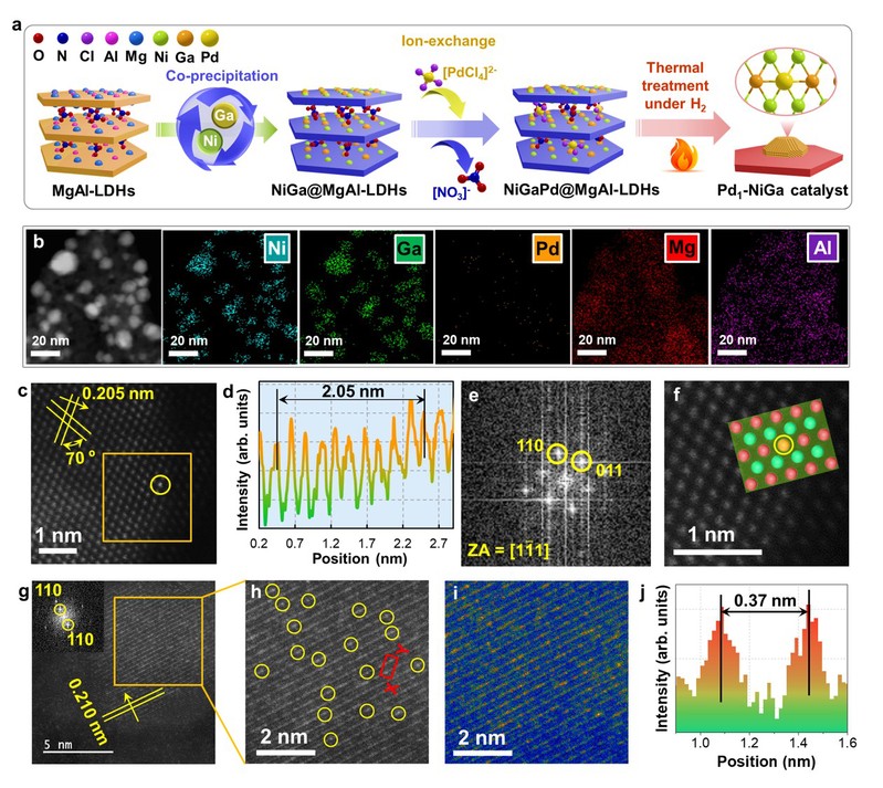 为此,研究团队针对具有完全隔离Ni位点的NiGa金属间化合物催化剂,利用双层金属氢氧化物材料(LDHs)的层间阴离子可交换性和结构拓扑转变特性,在NiGa金属间化合物表面嵌入单原子Pd,并借助球差电镜、X射线吸收光谱等结构表征和理论计算对催化剂结构进行解析,证实Pd物种是以单原子的形式嵌入至NiGa金属间化合物中原有Ga位点上,形成了具有Pd1Ni2Ga1集团位点的Pd1-NiGa催化剂。结合吸附构型解析、电子结构分析、原位红外光谱表征等机理研究手段,发现单原子Pd与Ga隔离的邻近Ni位点协同作用,实现了其与表面关键物种的构型匹配,促进了反应物炔烃的σ-吸附和氢气的解离,同时促进了目标产物烯烃的脱附,预示其具有优异的催化加氢性能。催化反应性能评价进一步表明,Pd1-NiGa催化剂在乙烯和丙烯选择性超过96%时,乙炔和丙炔加氢活性均明显高于目前已报道的炔烃加氢催化剂。可见,单原子Pd与邻近Ni位点的协同作用在NiGa金属间化合物上展现出“点石成金”(Midas touch)的效果,为进一步设计高性能低碳炔烃加氢催化剂提供新的思路。