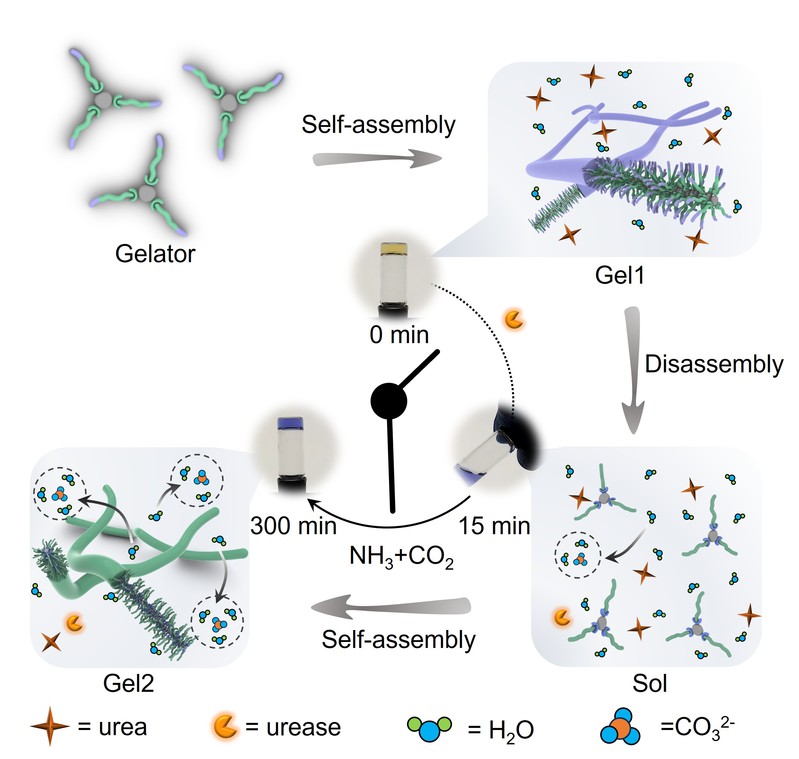 研究人员提出将酶促反应与Hofmeister效应相耦合的思想,成功构筑出能够动态感知Hofmeister离子序列的智能超分子水凝胶,模拟生命体对微环境变化的自适应感知行为。团队设计的凝胶因子含有羧酸基团,其自组装行为可被尿素水解生成的亲液离子NH₄⁺、CO₃²⁻(Kosmotropic ions)精确调控。在脲酶催化下,尿素水解产生的碱性NH₃和亲液离子诱导凝胶经历从Gel1到溶胶Sol再到Gel2的自主转变,实现对离子信号的实时感知与力学状态的动态演变,将化学信号有效转化为宏观物性变化,为多模态输出和智能反馈奠定了基础。