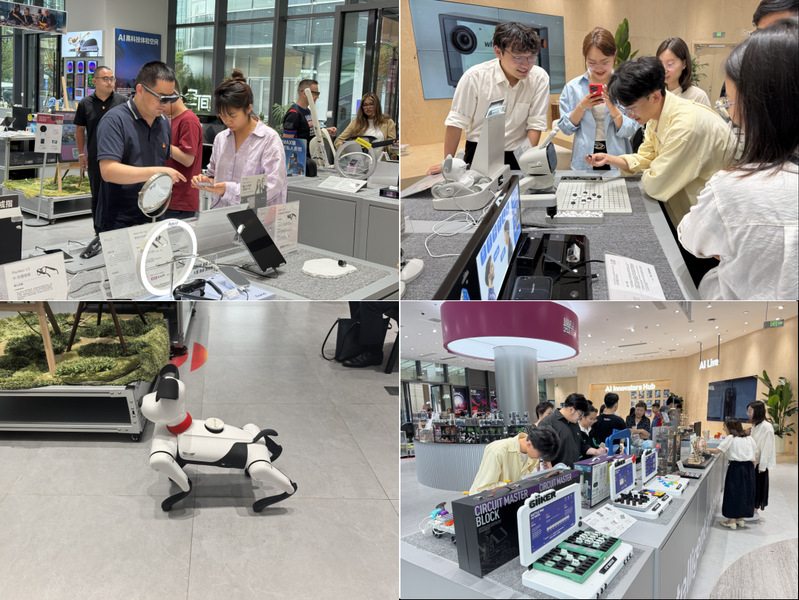 活动首站,师生党员走进中国首个大模型创新生态社区——模速空间。在人工智能产品展厅,党员们推动自动跟随的智能行李箱,感受物联网技术的便捷;弹奏智能无弦吉他、敲打空气架子鼓,惊叹于动作捕捉技术的精准;佩戴实时翻译眼镜,体验即时翻译的高效;与形态逼真的智能小狗互动,领略人工智能在生活场景中的创新应用。这些沉浸式体验让师生们直观感受到人工智能的无限潜力,也为化工领域智能化发展带来新思考。