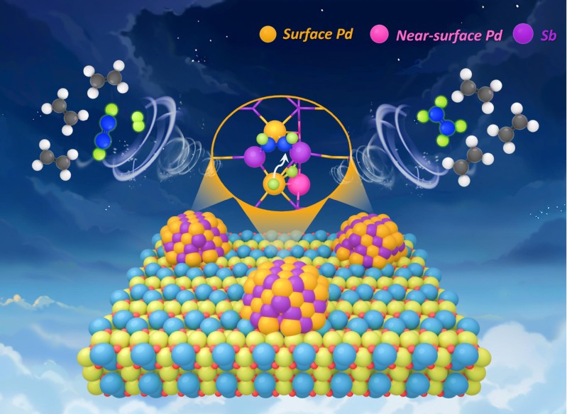 低碳炔烃选择性加氢是基于石脑油和低碳烷烃裂解制备聚合级乙烯和丙烯的关键反应。尽管传统Pd基催化剂因未填充的d轨道电子结构表现出高活性,但在高炔烃转化率下仍易发生过度加氢和偶联副反应。先前研究表明,通过精确调控活性位点的电子结构和空间构型,实现炔烃的强σ吸附和烯烃的弱π吸附,从而打破活性与选择性之间的制约关系(J. Am. Chem. Soc. 2024, 146, 4993;Angew. Chem. 2024, 63, e202410979;Nat. Commun. 2022, 13, 5534)。催化剂表面活性位点的精准设计可以实现烃类分子的吸附构型匹配,但炔烃与氢气的竞争吸附往往导致氢活化受限。为此,研究团队提出表面-近表面位点协同催化设计理念,构建兼具表面Pd1Sb2三原子位点和近表面Pd位点的PdSb金属间化合物催化剂,实现了炔烃吸附与氢气活化的位点解耦,显著提升了低碳炔烃选择性加氢性能。