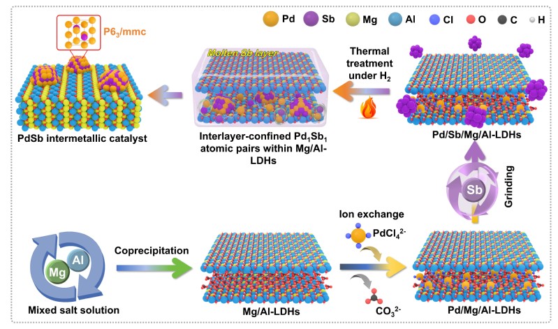 该团队利用Pd/Mg/Al-LDHs的层间限域效应实现Pd原子原位捕获熔融Sb原子,经过高温诱导有序化生成稳定的PdSb金属间化合物催化剂。球差电镜和X射线吸收谱解析了其表面Pd1Sb2三原子位点及近表面Pd位点的独特结构特征。结合吸附构型解析、HD同位素交换及原位红外光谱等机理研究手段,发现表面Pd1Sb2位点可以匹配炔烃的σ-吸附构型以及烯烃的π-吸附构型;同时,Pd1Sb2邻近的近表面Pd位点与其协同实现了H2自发解离。催化性能评价结果表明,该PdSb催化剂在模拟工业条件下,实现了乙炔和丙炔的100%转化,其中乙炔半加氢的乙烯选择性高达96.50%,丙炔半加氢的丙烯选择性高达98.65%,显著优于目前已报道的Pd基催化剂。